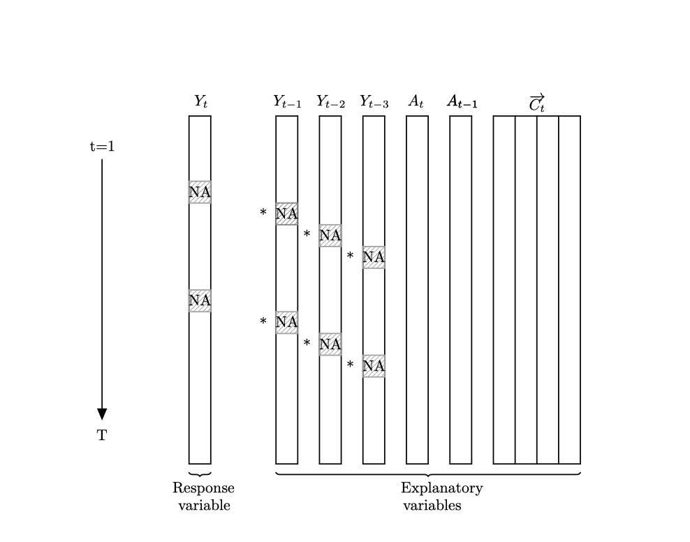printFlag=T formula="y~y_1+x+x_1" formula_var=unlist(strsplit(unlist(strsplit(formula,"~"))[2],"+",fixed=T)) ss_param=list(inits=c(log(0.25),log(1)),m0=c(40,0.5,-1,-0.5),C0=diag(rep(10^3),4), AR1_coeffi=NULL,rw_coeffi="intercept", v_cp_param=NULL, w_cp_param=NULL,max_iteration=100) head(data_space_SSMimpute) result_statespace_SSMimpute1=run.SSMimpute_unanimous_cpts(data_ss_ori=data_space_SSMimpute,formula_var,ss_param_temp=ss_param, initial_imputation_option="StructTS", estimate_convergence_cri=0.01, lik_convergence_cri=0.01, stepsize_for_newpart=1/3, max_iteration=100, cpt_learning_param=list(cpt_method="mean",burnin=1/10,mergeband=20,convergence_cri=10), cpt_initial_guess_option="ignore", dlm_option="smooth",m=5,seed=1,printFlag=F)