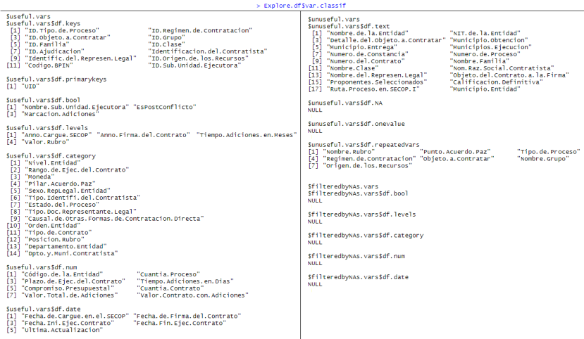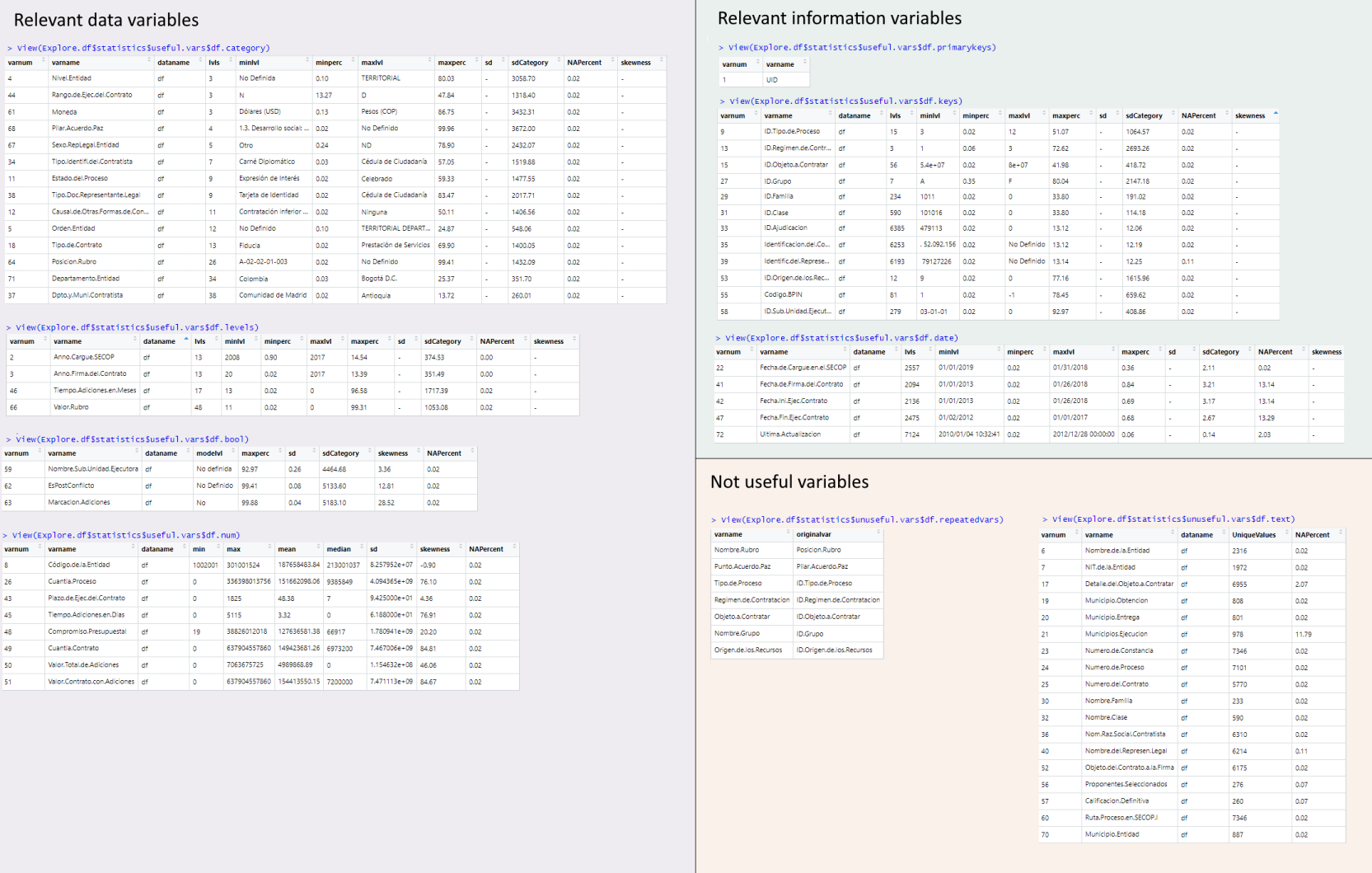 LDE.Explore() classifies the variables by its type and usefulness. It generates descriptive statistics, but doesn't transform the data. Useful for datasets of gygabytes, where the RAM is limited